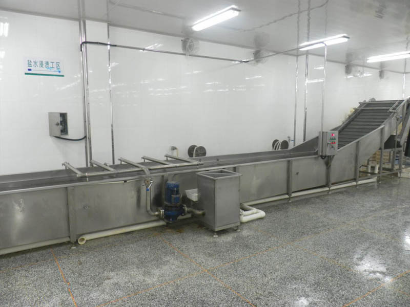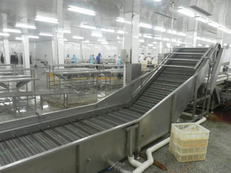去冰清洗機(jī):該機(jī)主要作用是清除解凍后原料上附帶的冰塊,通過中間帶有刮板大滾子網(wǎng)鏈輸送提升,兩隔網(wǎng)鏈中間設(shè)有鼓泡,使原料解凍更加徹底。