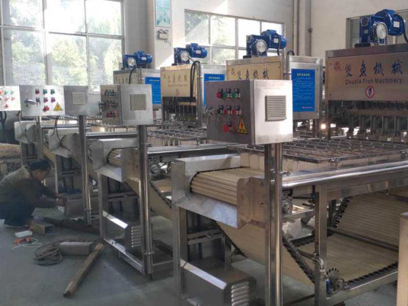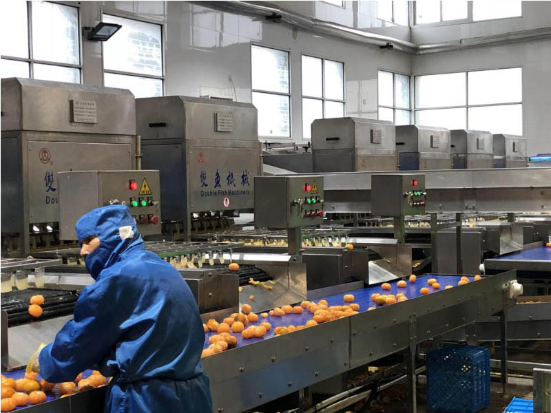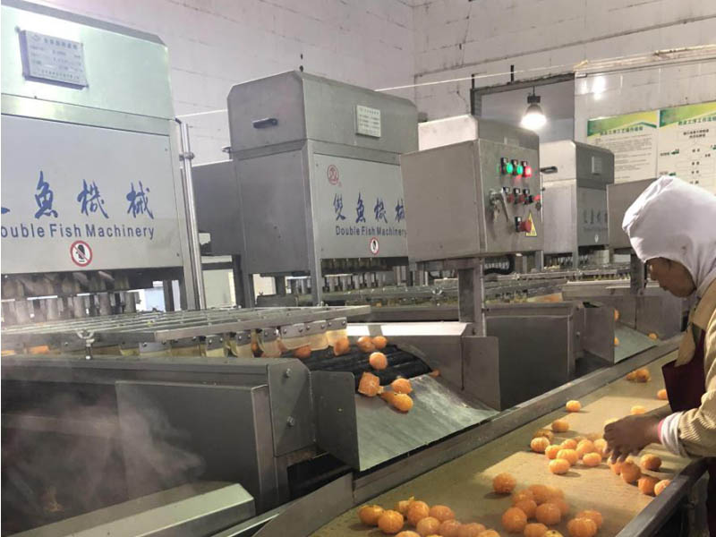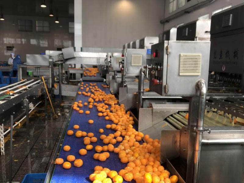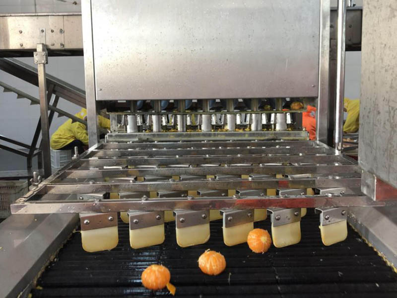 桔子自動(dòng)剝皮機(jī):本機(jī)主要由劃皮機(jī)構(gòu)、剝皮機(jī)構(gòu)、噴水系統(tǒng)、輸送系統(tǒng)以及電控裝置等組成。桔子在清洗熱燙后,輸送給高速旋轉(zhuǎn)的剝皮刀,桔子外皮在瞬間觸及刀刃處局部皮被劃撕翻開,劃皮后的桔子被導(dǎo)送入對(duì)輥輸送帶上,因輥?zhàn)邮怯绍浻策m中的硅橡膠制作,通過(guò)相對(duì)旋轉(zhuǎn)運(yùn)動(dòng)的一對(duì)對(duì)輥?zhàn)樱軐⑵ひ褎澦悍_的桔子的整個(gè)桔皮由小到大逐漸脫落,完整剝下。不僅可以對(duì)桔子進(jìn)行劃皮,通過(guò)改變不同部位的大小高度,適應(yīng)不同大小的桔子以外,還可以對(duì)橙子、柚子等等需要去皮的產(chǎn)品進(jìn)行去皮。 |